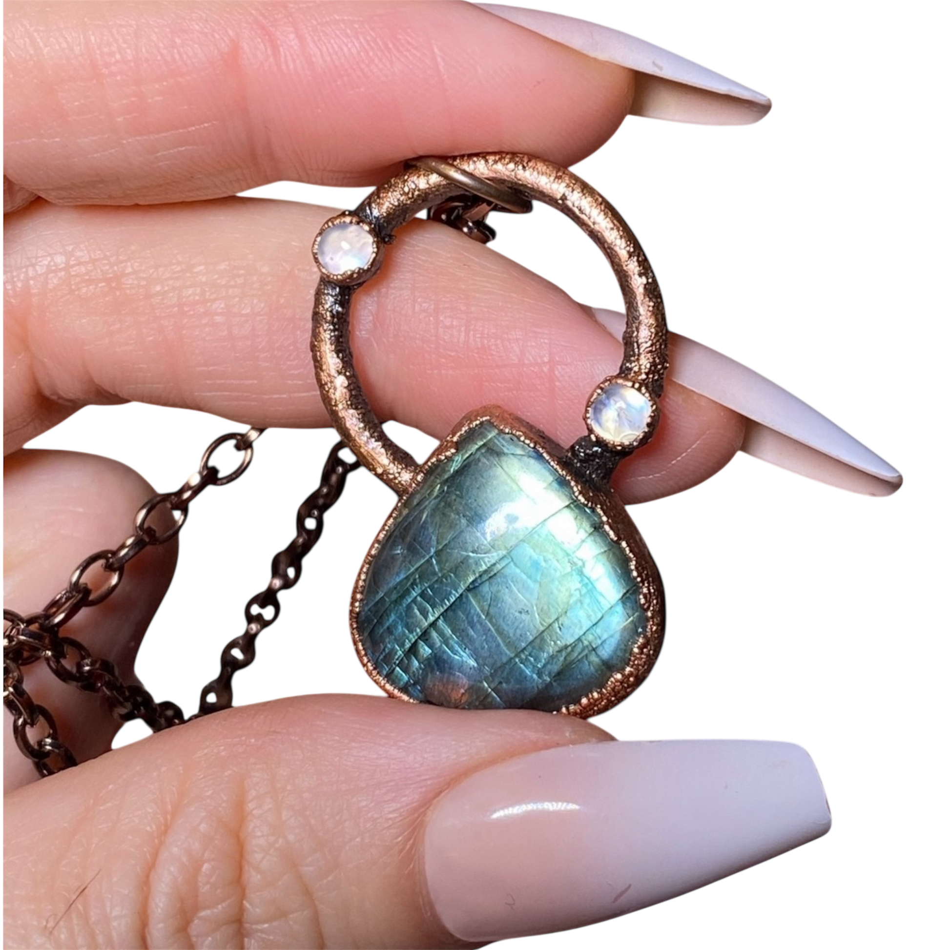This one-of-a-kind pendant pairs the deep, iridescent flash of labradorite with two soft, glowing moonstones—a blend of divine protection and intuitive clarity. Labradorite is known for its ability to shield the aura and activate inner vision, while moonstone supports emotional balance, feminine flow, and connection to lunar rhythms.