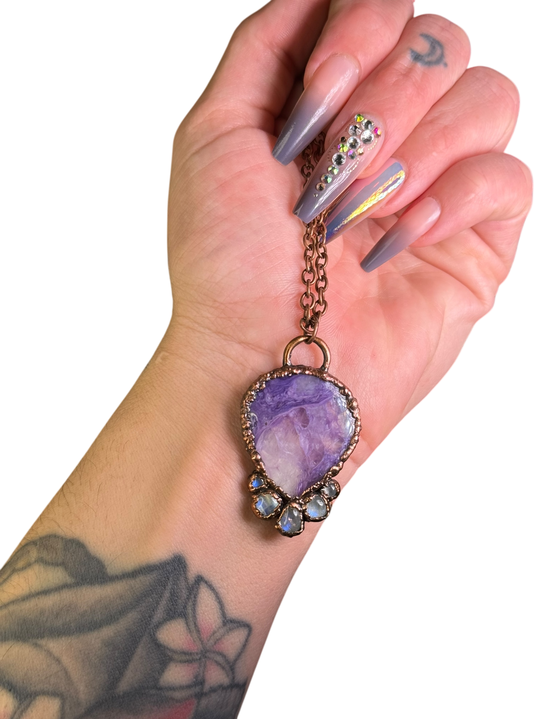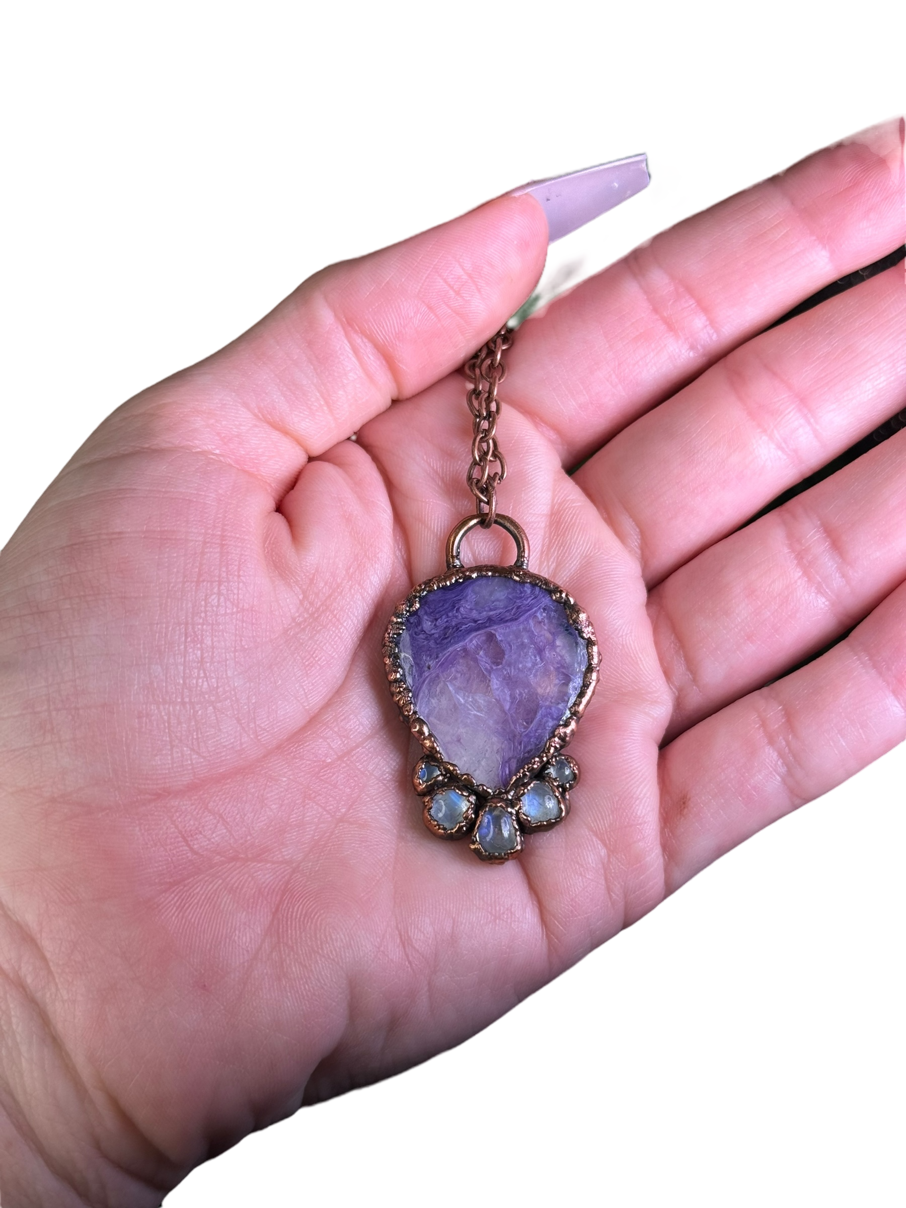 This enchanting pendant features a raw charoite centerpiece framed with soft, luminous moonstones—creating a portal of intuition, inner alchemy, and sacred feminine power. Charoite is a rare and high-vibration stone known for deep spiritual insight, transformation, and courage through change. Moonstone brings soothing balance, emotional flow, and connection to divine cycles.