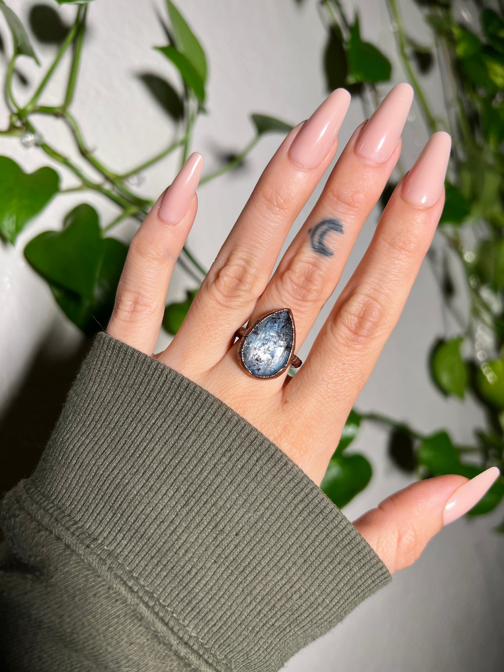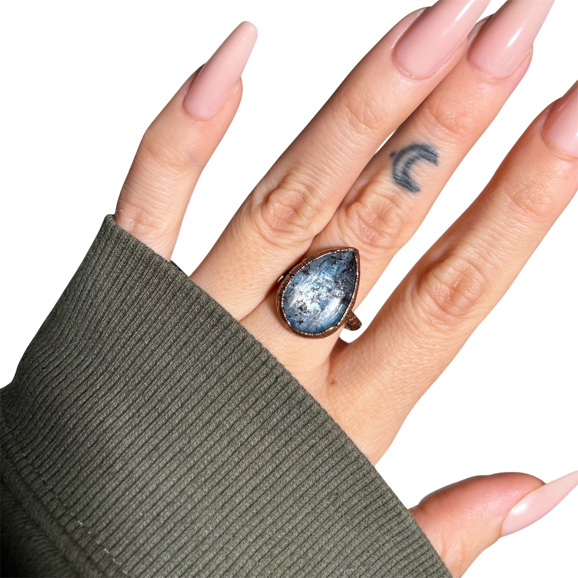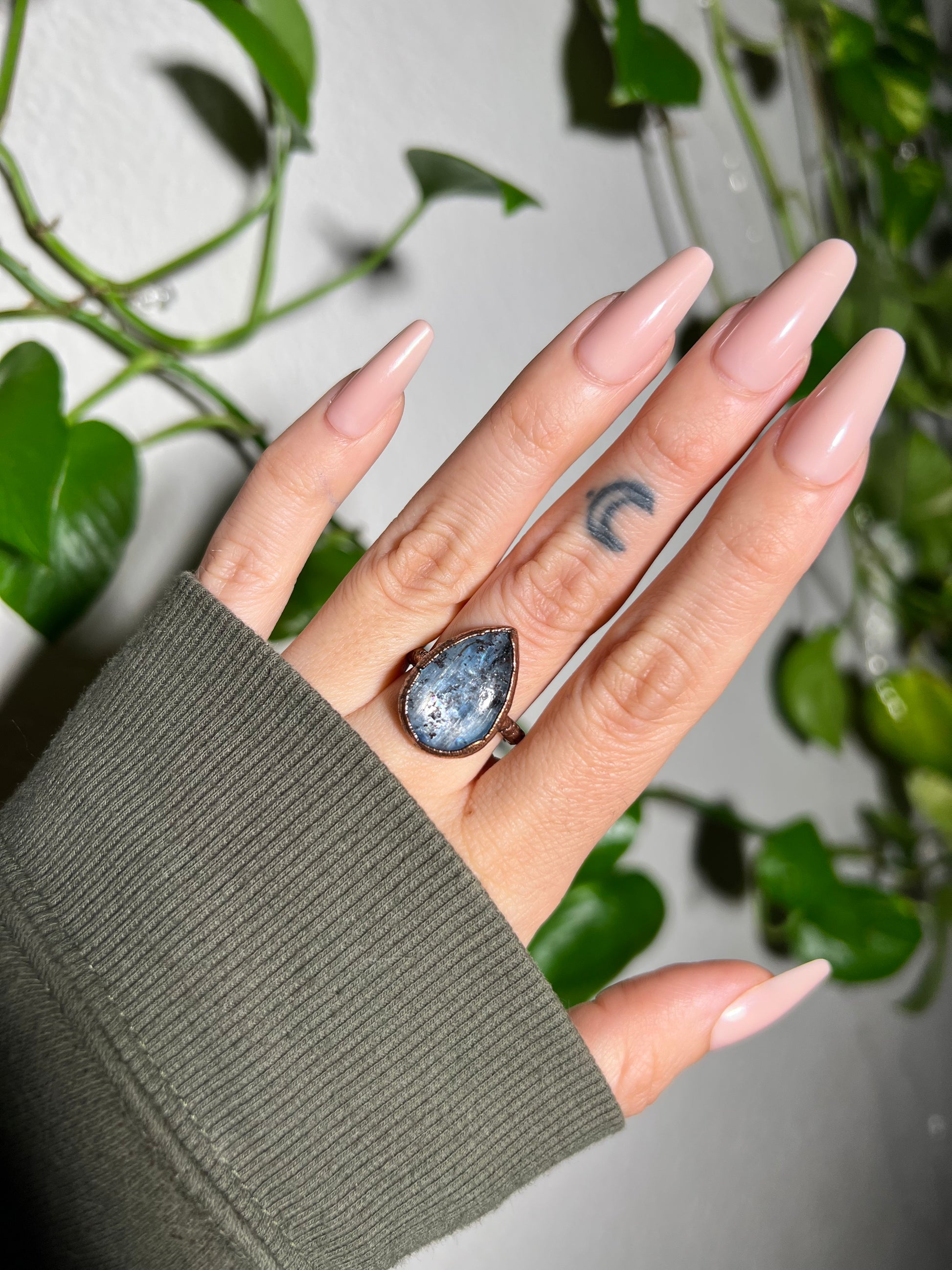 This striking ring features a blade-like piece of blue kyanite, set in sealed copper to highlight its raw, natural shimmer. Blue kyanite is a stone of energetic alignment and truth—known for clearing blockages, balancing the chakras, and encouraging honest self-expression without absorbing negative energy.