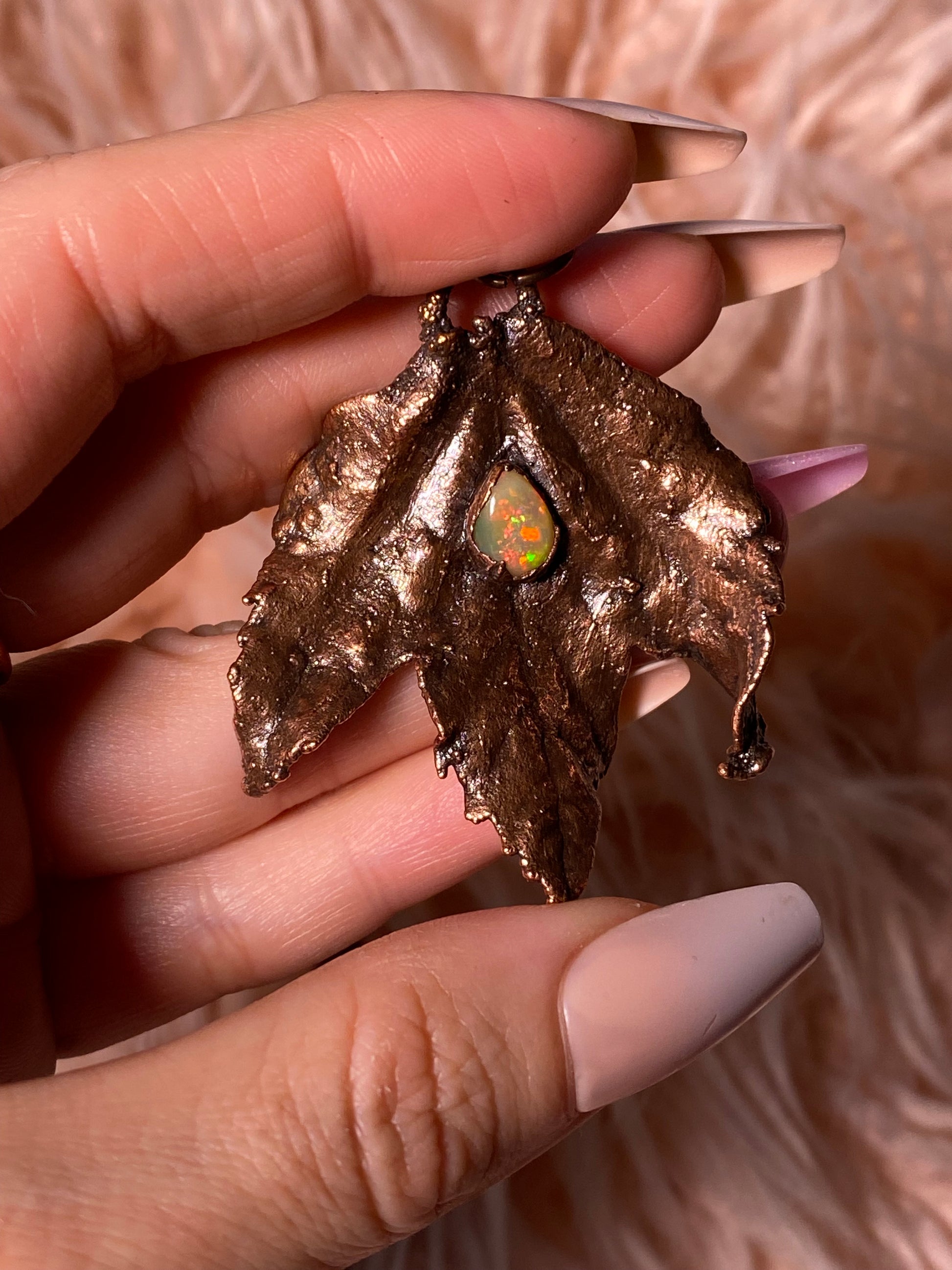 This pendant began as a real leaf foraged from nature—carefully preserved and transformed into wearable art. Nestled at the heart is a glowing opal, symbolizing intuition, emotional clarity, and connection to the unseen.